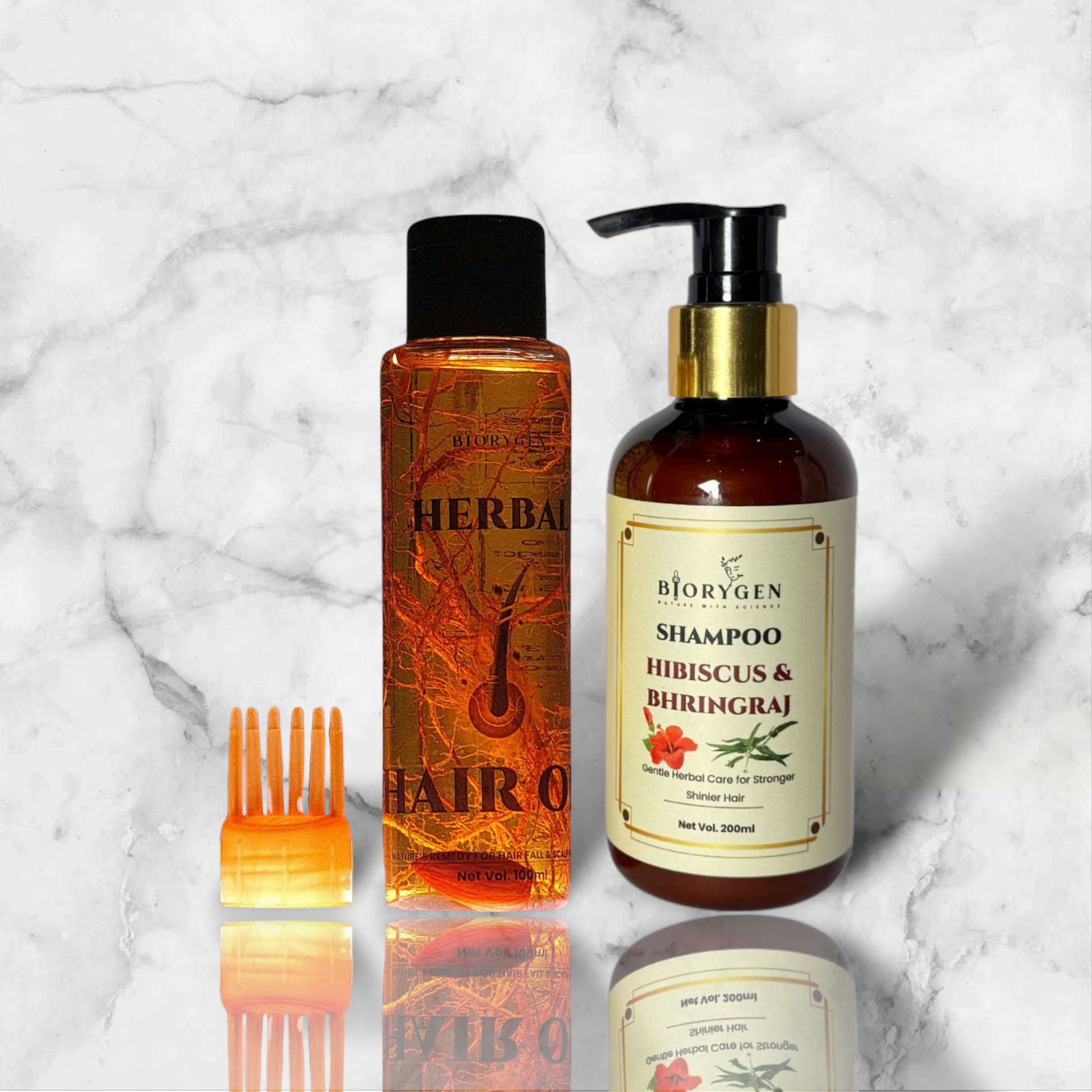 BioRyzen HerbalHair Oil + Hibiscus & Bhringraj Shampoo Combo – Repair & Shine Ayurvedic Hair Care Set
