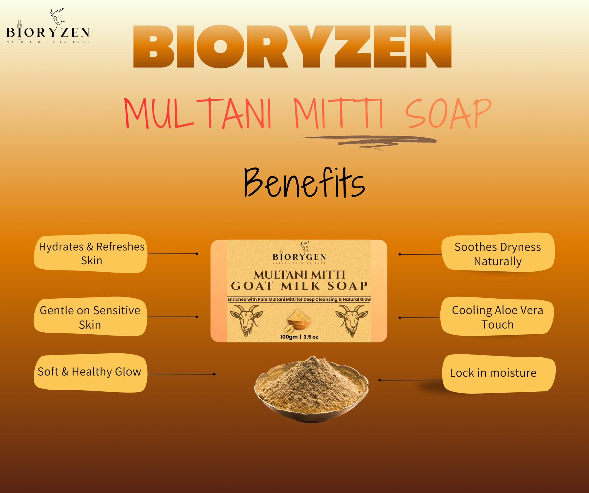 BioRyzen Multani Mitti Goat Milk Handmade Soap – 100g (Combo3+1 Free = 400gm) | Natural Clay & Milk Bathing Bar for Smooth & Radiant Skin (With Jute Bag)
